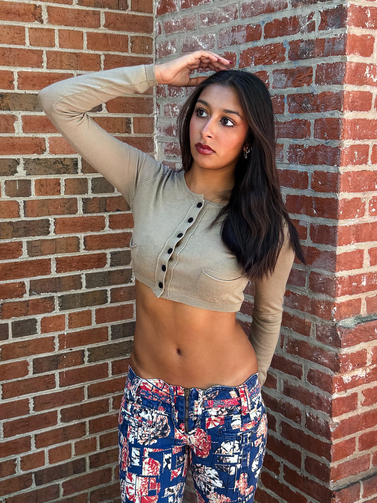 We sourced this early-2000s Twin Set cropped cardigan for its ultra-cropped silhouette, 100% merino wool fabric, and gold heart logo accent at the back. The piece features a button-front closure, small chest pockets, and a close, body-skimming fit that captures the feminine tailoring Twin Set became known for in the 2000s.