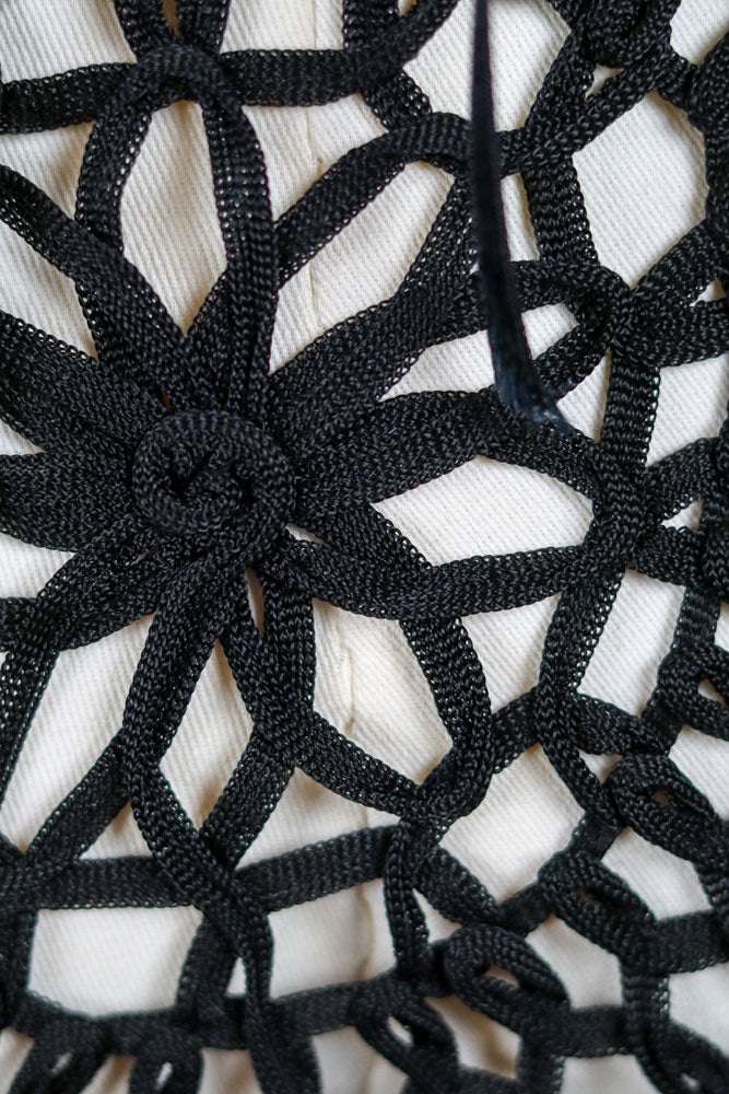 I sourced this early 2000s Enzo Loco dress because the crochet paneling is unreal. Enzo Loco was an early 2000s Parisian brand known for clubbing dresses and dramatic silhouettes, and pieces like this can really only be sourced in France. The macramé cutouts, lace up back and asymmetric ruffled hem make it such a standout night-out dress.