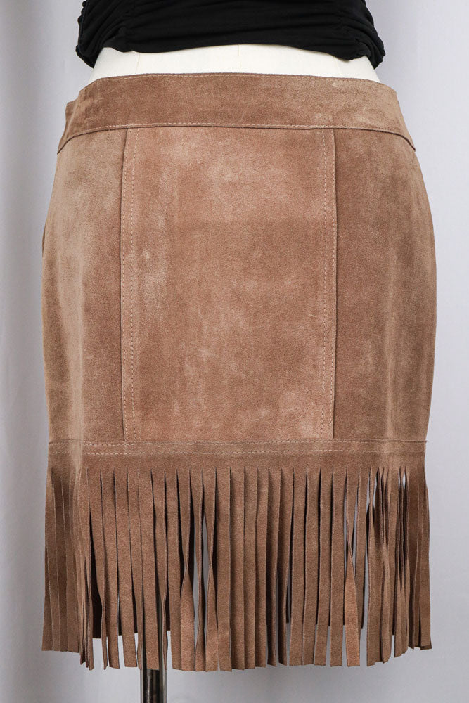 I sourced this early 2000s Blumarine skirt because I love suede and fringe right now. The suede is structured, so it holds its shape while still feeling soft. The fringe adds just enough movement without taking over, and the clean paneling keeps it looking polished instead of western.