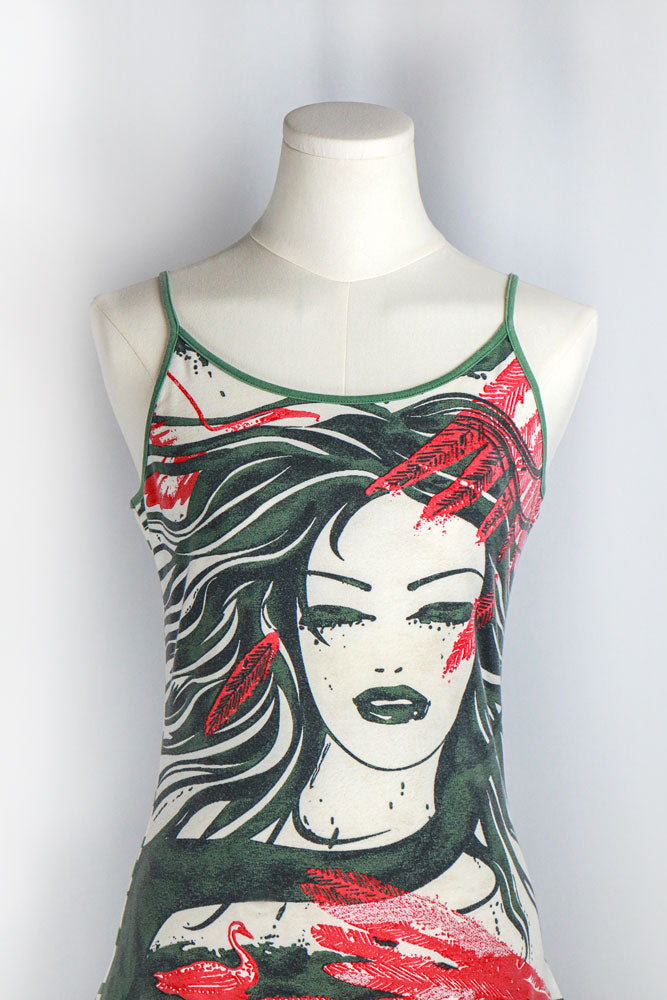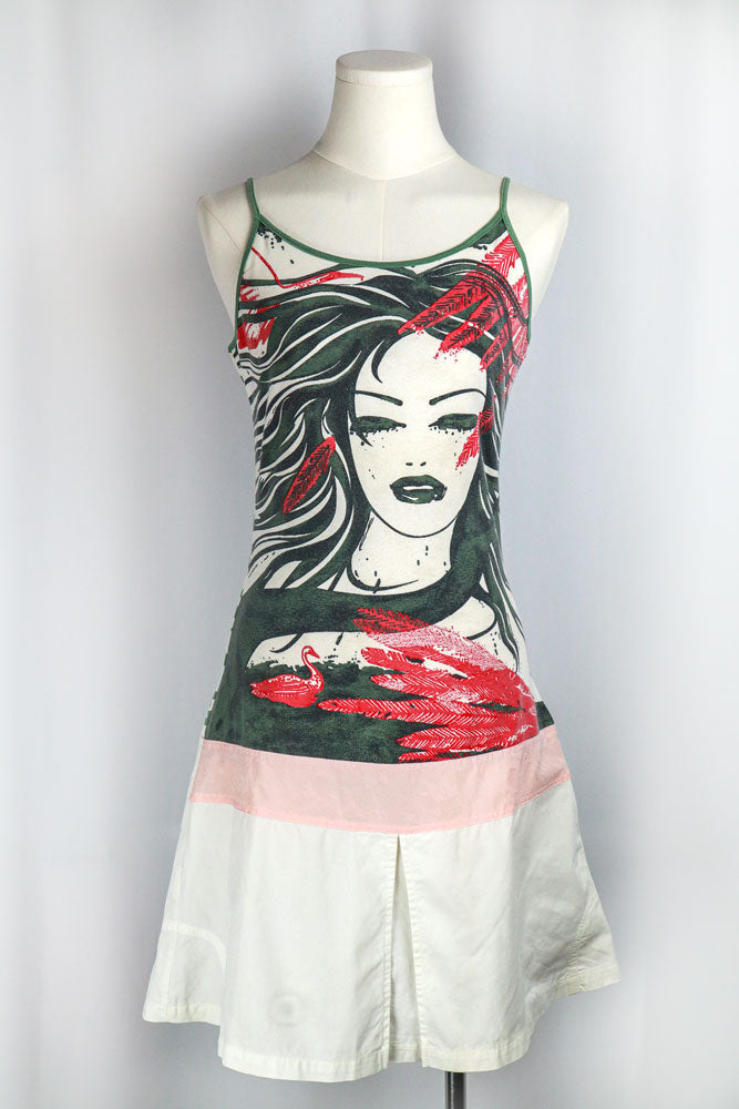 Custo Barcelona 2000s Green and Pink Graphic Drop Waist Mini Dress