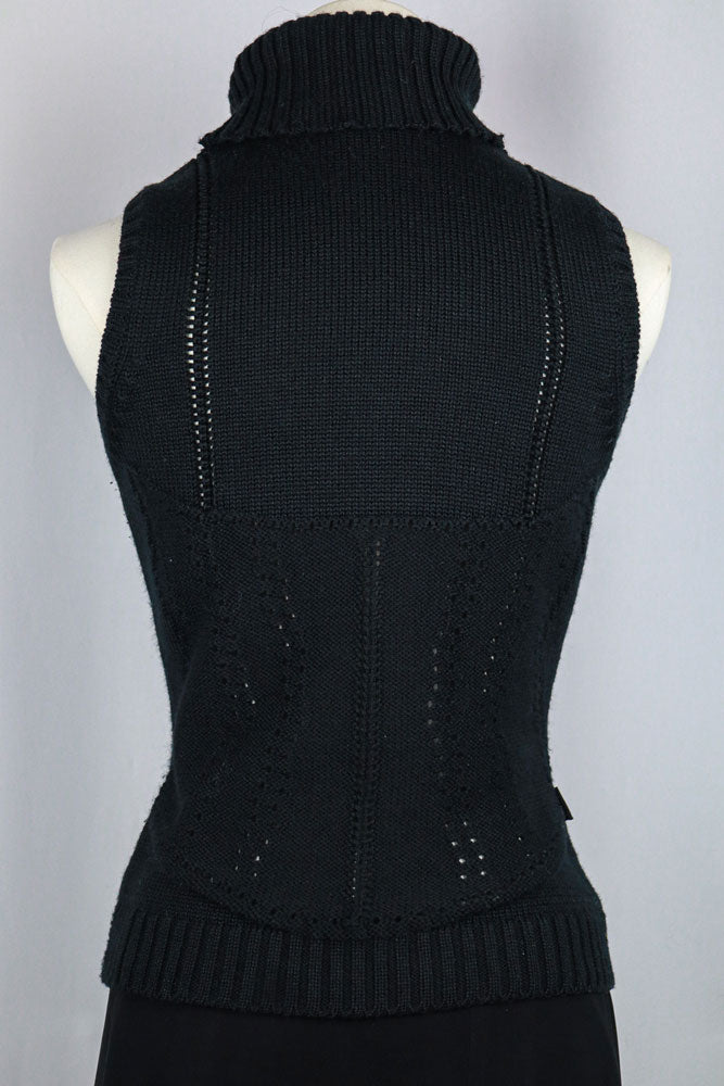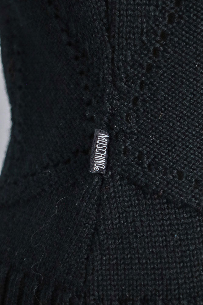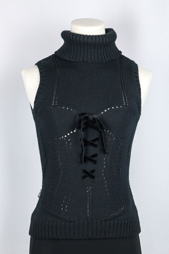I sourced this Moschino top because the shape is so good and the corset knit detailing feels really special. The velvet lace-up front adds just enough drama while still keeping it wearable, and the ribbed turtleneck balances the silhouette in a cool way. The knit is soft and stretchy, so it skims the body and gives a flattering fit without feeling tight. It pairs perfectly with denim or a mini for a cleaner, evening look.