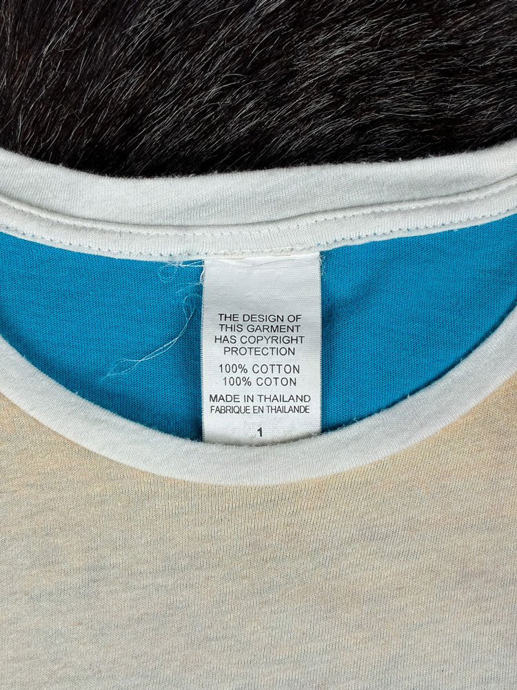 We sourced this Custo Barcelona top for its signature architectural print — a hallmark of the brand’s early 2000s collections. The front features a geometric house motif and tropical accents, while the back contrasts in a solid blue cotton with a ribbon tie at the neckline. Playful yet structured, it’s a classic Y2K piece from the Barcelona-based label’s bold era.