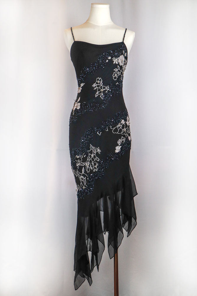 Italian 2000s Black Silk Beaded Asymmetrical Dress