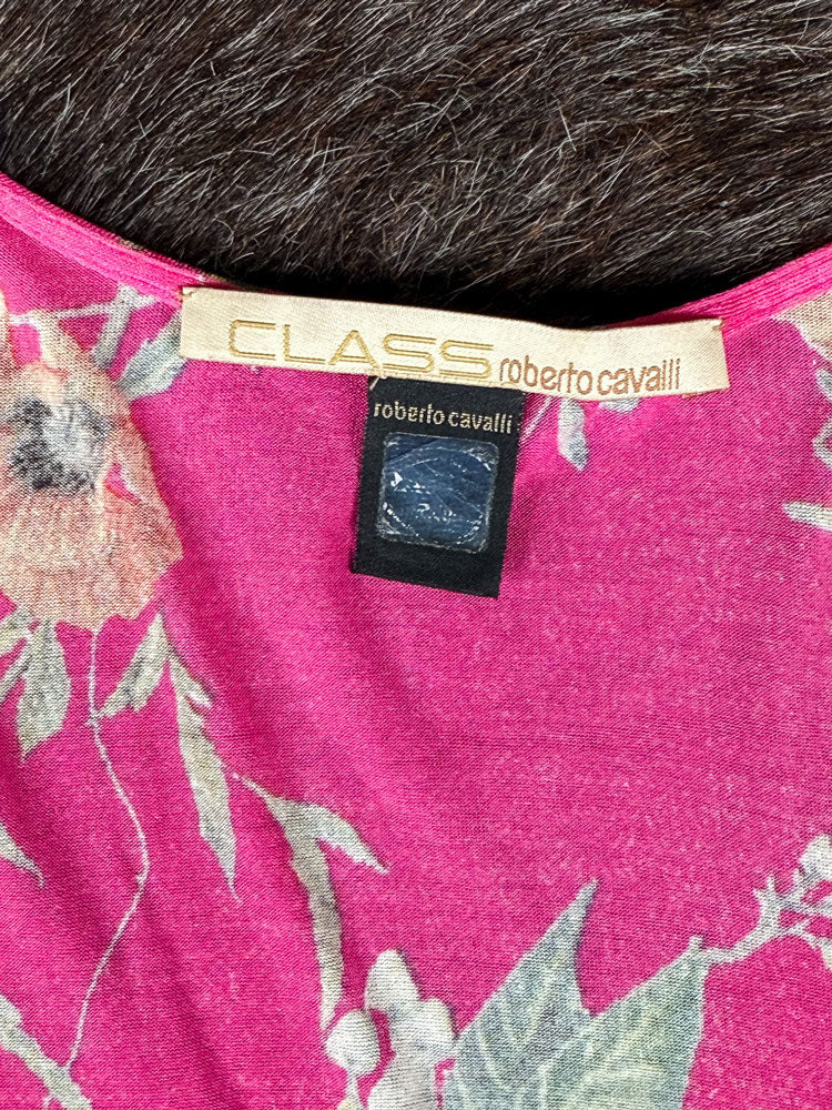 We sourced this early-2000s Class Roberto Cavalli dress for its vivid fuchsia floral print and fluid silhouette. Crafted in ultra-soft viscose jersey, it features a striking pink botanical pattern, a drop waist, and Cavalli’s signature draped cut that moves beautifully with the body.