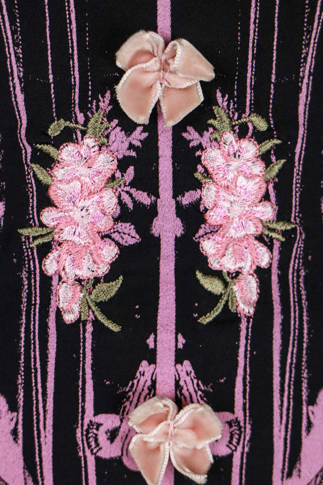 I sourced this Blumarine tank because the corset-illusion print and pink bow appliqués feel so feminine and flirty in that early Blumarine way. The mesh neckline ruffle and stretchy nylon blend make it an easy, body-skimming piece that looks incredible styled with denim or a mini. It’s such a fun take on their ultra-girly era.