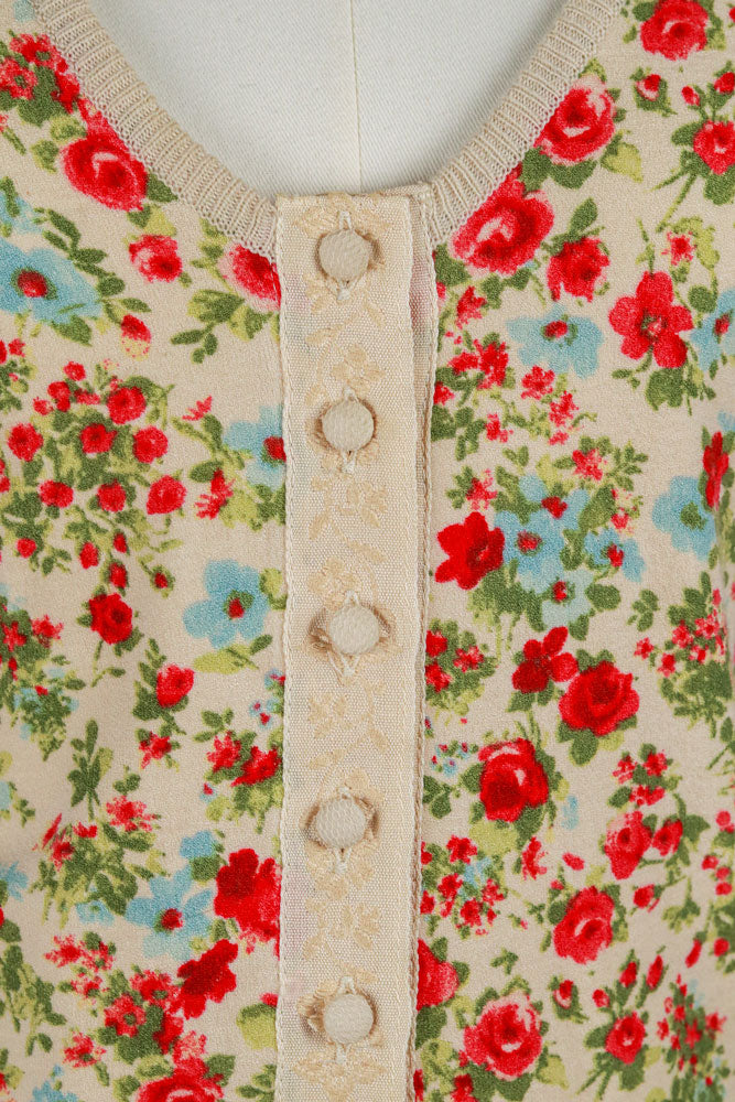 I sourced this early 2000s Blumarine cardigan because the floral print is so pretty and the shape is genuinely flattering. The fitted waist and covered buttons make it feel soft and feminine without trying too hard. The knit has a nice stretch to it, so it hugs the body in a comfortable way and looks great on its own or layered.