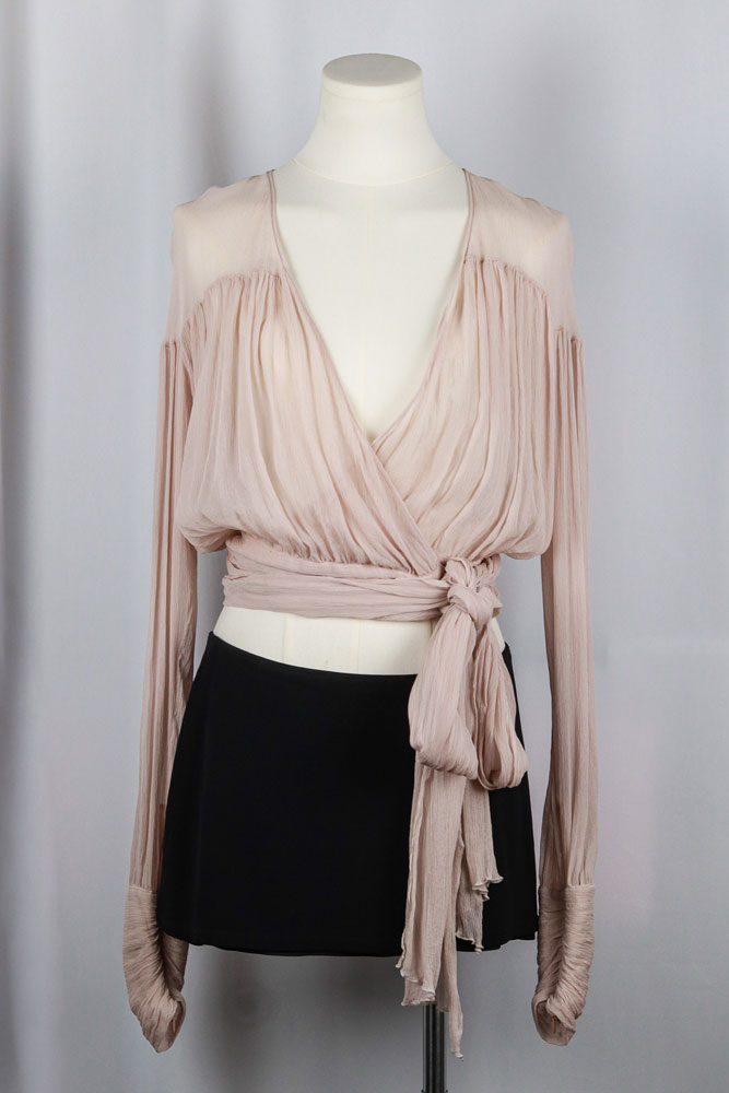 I sourced this early Blumarine wrap top because the fabric is beautiful and the shape is so romantic. The sheer crinkled chiffon has a soft drape that moves really nicely, and the long ties let you wrap it however you like. The sleeves are full and flowy with a slightly gathered cuff, which makes the whole piece feel effortless and feminine. It’s one of those tops that looks incredible with denim, a mini, or even styled over a slip dress.