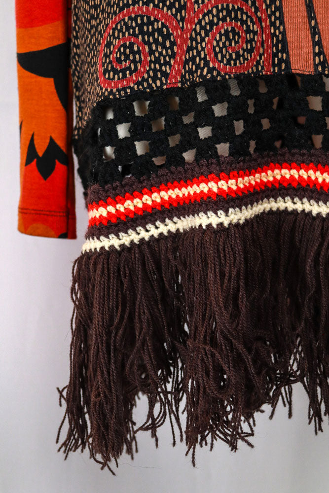 I sourced this Custo Barcelona bikini woman dress for the graphic artwork and bold color palette. The knit texture, fringe trim, and long sleeve shape give it that unmistakable Custo personality.